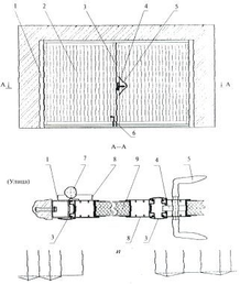 Рисунок 2 – Пример конструкции распашных ворот с утепленным щитовым полотном. 1 – несущие элементы обрамления проема; 2 – щитовое полотно; 3- нащельник притвора с уплотнительной прокладкой; 4 - замок; 5 - ручка; 6 - задвижка; 7 - петля; 8 – металлический профиль рамки (каркаса) полотна; 9 – заполнение полотна.
