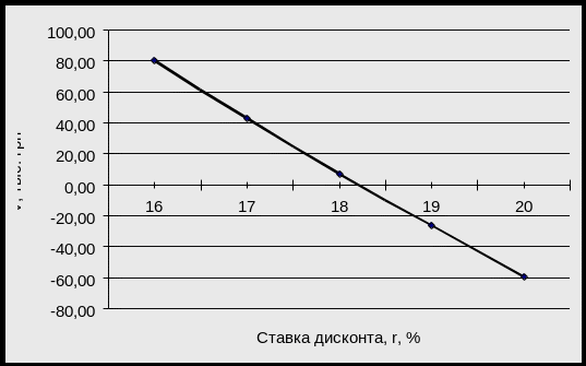 На основании таблице 2.19 построим график зависимости NPV от ставки дисконта для определения внутренней нормы доходности проекта. (рис. 2.5)