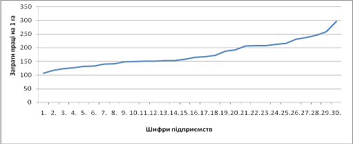 | № пор. | Шифр підприємства | затрати праці на 1 га, грн | № пор. | Шифр підприємства | затрати праці на 1 га, грн |