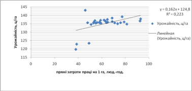 Проаналізувавши графік ми бачимо, що вимальовується майже прямолінійна залежність між затратами праці на 1га і урожайністю.