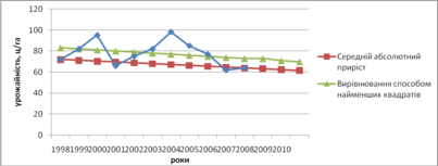 Виконавши прогнозування методами вирівнювання за середнім абсолютним приростом та аналітичним вирівнюванням способом найменших квадратів, можна сказати що на 2009-2011 роки урожайність картоплі має тенденцію до зростання.