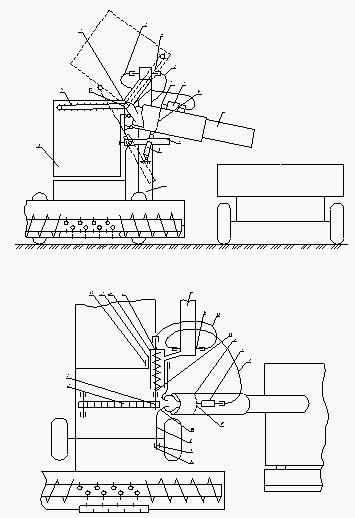 Основними складовими конструкції пропонуємого пристрою є елеватор 1, пристрій для завантаження зерна в бункер 2, подаючий транспортер 3, вивантажувальний пристрій 4, який має привід з гідроциліндром 5. Пристрій для завантаження зерна обладнаний з’єднаним з виходом елеватора питаючим шнеком, який встановлений паралельно з горизонтальною віссю повороту бункера. При цьому вісь повороту зернового бункера паралельна повздовжній вісі комбайна. Привід повороту зернового бункера здійснюється за допомогою гідроциліндра. Елеватор виконан з верхнім відомим валом, а подаючий транспортер з ведучим валом, який в свою чергу з’єднаний з валом шнека. Ведучий вал з’єднаний з приводом за допомогою гнучких валів, та встановлений паралельно вісі повороту зернового бункера. Зерновий бункер має вивантажувальне вікно, в якому встановлена спеціальна труба 9 зі шківом. Зерновий бункер встановлений на комбайні в опорних підшипниках за допомогою передньої 7 та задньої 8 цапф.