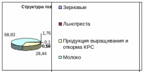На диаграммах хорошо видно, что за анализируемые годы молоко имеет наибольший удельный вес, следующей по значимости идее продукция выращивания и откорма КРС, что ещё раз доказывает, что хозяйство имеет молочно-мясную специализацию. Остальные виды продукции имеют незначительный удельный вес.
