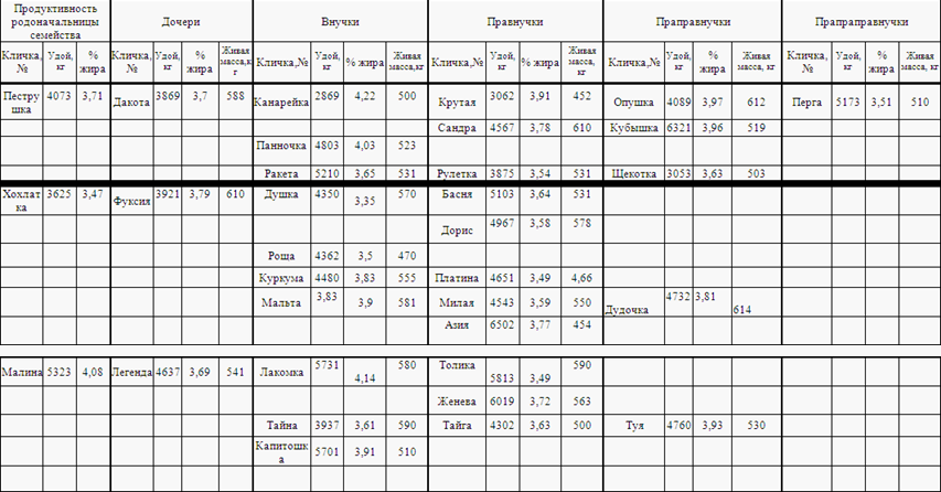 Работа с семействами основана на давно установленной связи между продуктивными качествами матерей и их дочерей Качества эти могут быть усилены путем использования в подборе производителей-улучшателей из ведущих линий данной породы. Целью работы с семействами и является развитие в потомстве коров-родоначальниц их ценных качеств путем использования в каждом поколении лучших линейных производителей. 4,5