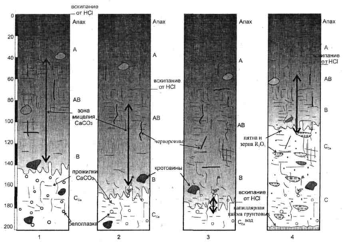 Рис. 2. Строение черноземов южноевропейской фации: 1 - чернозем обыкновенный (карбонатный); 2 - чернозем типичный; 3 - чернозем выщелоченный; 4 - черноземно-луговая почва