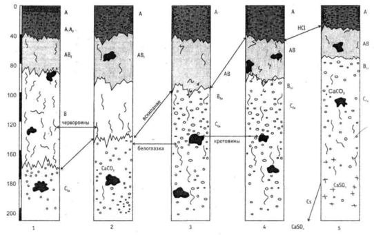 Рис. 1 - Строение черноземов восточноевропейской фации: 1 - оподзоленный; 2 - выщелоченный; 3 - типичный; 4 - обыкновенный; 5 - южный