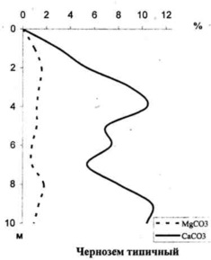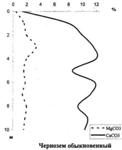 Генетическая специфика содержания карбонатов отражается типично черноземным карбонатным профилем: отсутствие или малое содержание СаС03 в верхних горизонтах, постепенное увеличение количества карбонатов до иллювиально-десуктивного горизонта карбонатных конкреций и затем уменьшение их количества в материнской породе. Обычно карбонатный профиль фиксируется следующим количеством СаСО3: начало вскипания от 10% НСl-0,3%, слабое вскипание - 0,3-2,0%), сильное вскипание и постепенное возрастание количества карбонатов - 2,0-8,0(10,0)%, иллювиально-десуктивный горизонт скопления извести - 8,0(10,0) - 10,0 (12,0)%, уменьшение количества карбонатов в материнской породе (лессовидных глинах и суглинках) до 8,0-10,0%. Особенности материнских пород могут вносить свои коррективы в приведенный идеальный профиль распределения карбонатов, например, в черноземах остаточно-карбонатных и бескарбонатных.
