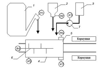Рисунок 1.1 – Технологическая схема линии раздачи корма в свинарнике: 1 — запарник-питатель картофеля; 2 — дозатор-питатель концкормов; 3 — емкость для обрата; 4 — раздатчик-смеситель кормов; 5 — выгрузное устройство; 6 — мешалка; 7 — насос; М5 — привод кормораздатчика (кормораздатчик на рисунке показан в плане).