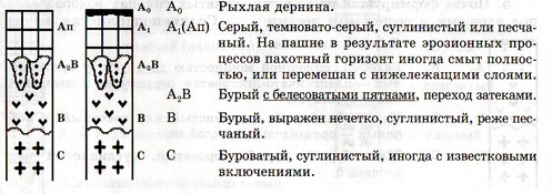 На глубине 90-150 см иллювиальный горизонт постепенно переходит в плотную, красно-бурого, желтого или палевого цвета материнскую породу, из которой образовалась почва. Материнская порода определяет механический и химической состав почвы, а также степень ее оподзоленности и другие свойства.