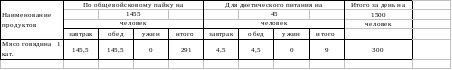 По числу питающихся в выбранный день определяется количество продуктов, подлежащих обработке отдельно на каждый приём пищи и в целом за сутки по общевойсковому пайку и для диетического питания (3% от общей численности питающихся). Полученные данные сводятся в табл. 1.