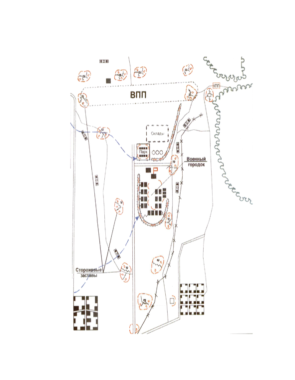 Схема № 1.Фортификационного оборудования базового района в форме военного городка (вариант)
