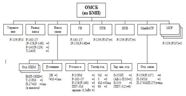 Приведем в качестве примера распределение средств радиосвязи в омсб (на бмп) по подразделениям.