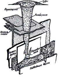 Скорость движения прорывающейся магмы, вероятно, могла быть очень большой, около 800 км/ч, магма отрывала и выносила вверх обломки разного состава. Если в них содержались алмазы, трубка становилась алмазоносной. Сами же алмазы являются наиболее стабильной полиморфной модификацией углерода в глубинных зонах Земли. (А.В. Уханов.)