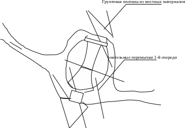 Под защитой строительной перемычки 2‑й очереди отсыпается грунтовая плотина. Пропуск строительных расходов осуществляется через трубы уложенные в левом рукаве реки.