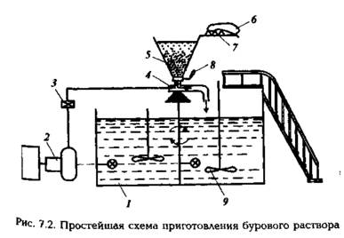 Наиболее простая технологическая схема (рис. 7.2) включает емкость для перемешивания компонентов бурового раствора 1, оснащенную механическими и гидравлическими пе-ремешивателями 9, гидроэжекторный смеситель 4, оснащенный загрузочной воронкой 5 и шиберным затвором 8, центробежный или поршневый насос 2