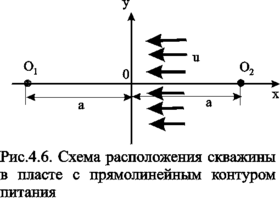 Данная задача может возникнуть при расположении добывающей скважины вблизи сброса или около границы выклинивания продуктивного пласта. В этом случае реальную скважину-сток зеркально отображают относительно непроницаемой границы, и дебиту скважины - отображения приписывают тот же знак, что и дебиту реальной скважины. При притоке к двум равнодебитным скважинам скорость фильтрации на непроницаемой границе будет направлена вдоль границы, т.е. граница является линией тока и фильтрация через неё отсутствует. Дебит скважины определяется из уравнений (4.16) и (4.17) для n=2 в пласте с удалённым контуром питания: