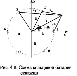 Пусть центры скважин располагаются в вершинах правильного n-угольника, т.к. что скважины образуют кольцевую батарею радиуса а (рис. 4.8). Контур питания удалён от скважин на расстояние, значительно превышающее радиус батареи и тогда можно считать, что все скважины равноудалены от контура питания на расстояние rк. Будем считать, что на контуре питания поддерживается постоянное значение потенциала к и на контуре скважин потенциал постоянен и равен с. В данной постановке следовательно надо решить задачу о плоском течении к n точечным стокам, размещённым равномерно на окружности радиуса а. Для получения формулы дебита скважин воспользуемся формулой (4.2)
