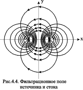 Семейство линий тока ортогонально изобарам и, следовательно, в данном случае тоже окружности. Все линии тока проходят через сток и источник. Центры всех окружностей линий тока расположены на прямой, делящей расстояние между стоком и источником пополам (рис.4.4).