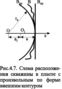 В естественных условиях контур питания имеет произвольную форму и её не всегда удаётся определить. Кроме того, часто не удаётся определить достаточно точно и расстояние а от скважины О1 до контура. Можно ли в этом случае пользоваться формулой предыдущего раздела? Любой произвольный контур В находится между прямолинейным Впр и круговым Вкр. (рис.4.7).