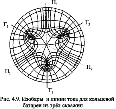 Плоскость течения (рис. 4.9) кольцевой батареи с n равнодебитными скважинами, размещенными в вершинах правильного многоугольника, делится на n равных частей (секторов) прямыми линиями тока Н, сходящимися в центре батареи и делящими расстояние между двумя соседними скважинами пополам. Эти линии тока называются нейтральными. Другое семейство прямых линий тока Г проходит через центры скважин и делит сектор, ограниченный двумя нейтральными линиями, пополам. Это - главные линии.