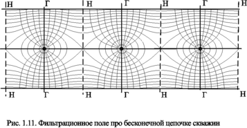 Здесь, как и в кольцевой батарее, имеются главные и нейтральные линии тока, перпендикулярные цепочке. Нейтральными линиями тока вся плоскость течения делится на бесконечное число полос, каждая из которых является полосой влияния одной из скважин, находящейся в середине расстояния между двумя соседними нейтральными линиями. Главные линии тока проходят через центры скважин, параллельно нейтральным линиям.
