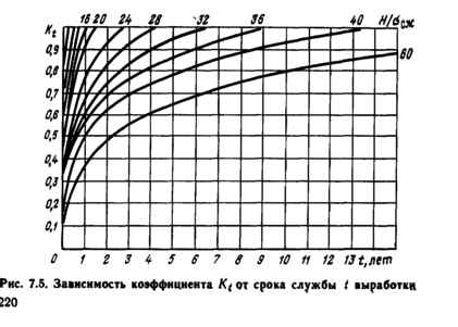 Кt - коэффициент влияния времени, принимаемый равным 1 для выработок, срок службы которых более 15 лет.д.ля выработок срок службы которых более года Кt определяется по рис.1.3. Смещения определяются отдельно для кровли, почвы и боков выработки.