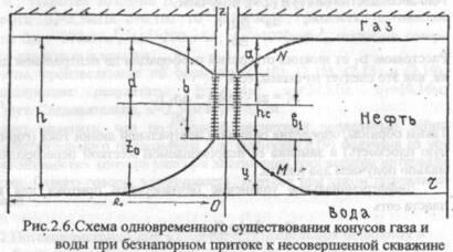 При эксплуатации нефтяных или газовых скважин с подошвенной водой, а также при дренировании нефтяной оторочки в определенных условиях проявляется тенденция к деформированию поверхности раздела двух фаз, которая принимает холмообразный вид, образуя конусы воды, конусы нефти или конусы воды и газа. При некоторых установившихся условиях отбора соответствующие деформированные поверхности раздела находятся в равновесии и не оказывают существенного влияния на приток добываемого флюида к скважине. Если же превысить депрессию и, соответственно, отбор нефти или газа сверх некоторой предельной величины, то вода прорвется в скважину, что может привести к ее прогрессирующему обводнению, а при дренировании нефтяной оторочки возможен прорыв подошвенной воды и верхнего газа. Таким образом, существует предельная высота вершины конуса, которой соответствуют предельная депрессия и безводный или безгазовый дебит.