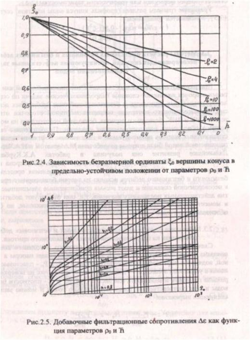где q(ρ0,Ђ) - безразмерный безводный дебит, определяемый по соответствующим графикам или таблицам (Прил.1) для параметра ρ0≤1 [79,82] и по графикам рис.2.3 для ρ0>1. Безразмерная ордината конуса ξ0=z0/h0 для ρ0>1 определяется по графикам рис.2.4, для ρ0<1 - по таблицам (см. Прил.1).