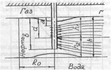 Рис.2.7.Схема одновременного существования конусов газа и воды в условиях напорного притока к несовершенной скважине