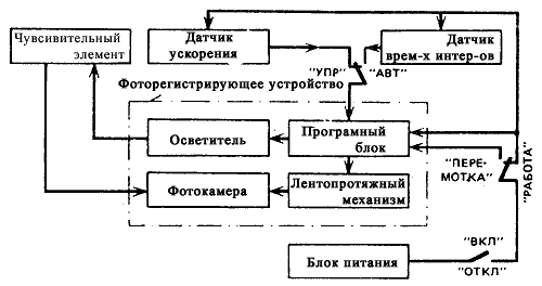 Инклинометрический блок скважинного прибора (рис. 9) состоит из чувствительного элемента 1, зенитных углов и азимутов; фоторегистрирующего устройства – автоматического фотоаппарата, состоящего из фотокамеры 2, механизма транспортирования фотопленки 3 с электромагнитом 5, кассет с пленкой и программного блока 4; пусковых устройств (датчика временных интервалов 7 и датчика ускорений 6); блока питания 8, размещенных в защитной гильзе [5].