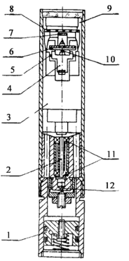1 – компенсатор давления; 2 – вал вращения с подшипниками 11; 3 – апсидальная рамка эксцентричная; 4 – маятник; 9, 10 – керны; б – картушка азимутальная; 7 – кольцо из органического стекла с делениями зенитных углов; 8 – стекло с неподвижными индексами отсчета зенитных углов; 9 – защитное стекло с воздухозаборником; 12 – шаровая опора чувствительного элемента