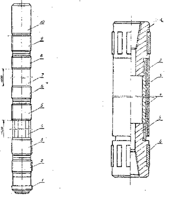 Компоновки, (рис. 12) включают в состав наружной трубы колонкового набора алмазные расширители, что позволяет им эффективно работать в перемежающихся по твердости породах. Между нижним и средним блоками расширителей-центраторов введена профилированная, обычно, семигранная труба. Использование компоновок в породах VIII – IX категорий, частично X категории, позволяет снижать интенсивность искривления скважин в 2 – 8 раз.