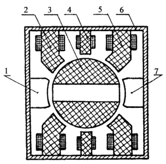 1 – датчик момента; 2, 5 – статор подвеса; 3 – ротор; 4 – статор двигателя; 6 – корпус; 7 – датчик угла