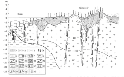 1 – осадочные породы земной коры; 2 – гранитный и базальтовый слой земной коры; 3 – верхняя мантия; 4 – зоны глубоких тектонических разломов; 5 – зона аэрации (вне масштаба); 6 – криолитозона; 7 – зона полного насыщения; 8 – зона подземных вод в надкритическом состоянии; 9 – нижняя граница зоны аэрации; 10 – подошва осадочных пород; 11 – нижняя граница зоны полного насыщения; 12 – граница Мохоровичича; 13 – направления движения «местных» потоков подземных вод; 14 – региональных потоков; 15 – глубинных субвертикальных потоков; 16 – возможное поступление ювенильных растворов; 17 – инфильтрационное питание; 18 – испарение грунтовых вод; 19 – захоронение морской воды с осадками и отжатие поровых вод