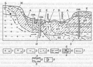 А – надмерзлотные воды сезонно-талого слоя; Б – воды сквозного дождевально-радиационного талика; В – надмерзлотные воды подозерного несквозного талика; Г – воды сквозного подруслового талика; Е – межмерзлотные воды; Ж – подмерзлотные воды неконтактирующие безнапорные; З – подмерзлотные воды неконтактирующие напорные; И – подмерзлотные воды контактирующие напорные; К – надмерзлотные воды несквозного дождевально-радиационного талика; 1 – изверженные трещиноватые породы; 2 – щебень и дресва; 3 – суглинки; 4 – пески, галечники; 5 – многолетнемерзлые породы и их граница; 6 – обводненность пород состояния (а), периодическая (б); 7 – направление движения подземных вод; 8 – подошва сезонно-талого слоя (б) и сезонно-мерзлого слоя (а); 9 – скважины, стрелкой показана глубина появления и установившийся уровень подземных вод