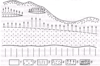 3 – слабопроницаемые породы, 4 – почвенный слой,
