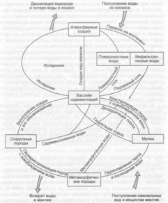 Рис. 4 Взаимосвязь гидрогеологического и геологического круговоротов воды в земных недрах (по Е.В. Пиннекеру, 1980)