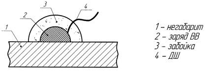Мы выбираем взрывной способ разрушения накладными зарядами. В шпур взрывчатое вещество с удельным расходом 2,5-3 кг/м3 располагают слоем 3-5 см и присыпают песком.