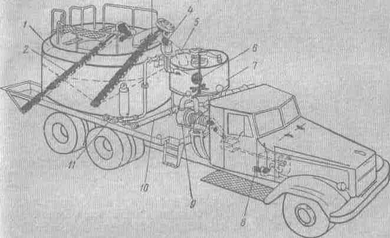 Загрузочный и рабочий шнеки, а также лопастная мешалка приводятся в действие гидродвигателями при помощи масляного насоса 8. Все агрегаты установки управляются с пульта, размещенного в кабине автомобиля.