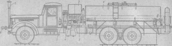 Автоцистерна 4ЦР предназначена для перевозки жидкости, используемой для гидравлического разрыва пласта, и подачи ее в пескосмесительный или насосный агрегат. Автоцистерна 4ЦР (рис. 5) смонтирована на шасси автомобиля КрАЗ-219 грузоподъемной силой 120 кН и состоит из цистерны 1, вертикального плунжерного насоса 2, системы обвязки насоса с арматурой 3, коробки отбора мощности 4, узла трансмиссии 5, узла жесткой буксировки б и искрогасителя 7.