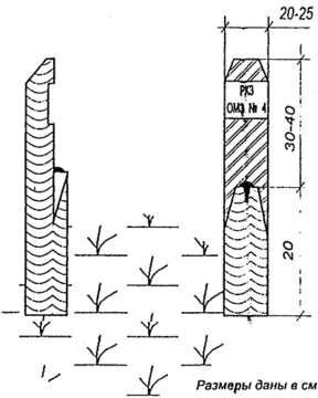 четырехгранной пирамиды с нижним основанием 20 х 20 см, верхним 15 х 15 см и высотой 20 см. На верхней грани монолиту делается крестообразная насечка или заделывается гвоздь. Верхнюю часть столба затесывают на конус, ниже затеса делают вырез для надписи;