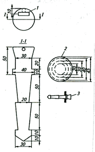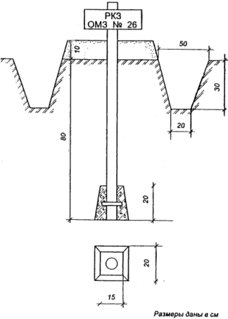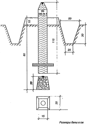 - бетонный монолит в виде усеченной четырехгранной пирамиды с нижним основанием 15 х 15 см, верхним 10 х 10 см и высотой 90 см с заделанным в него кованым гвоздем;