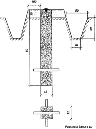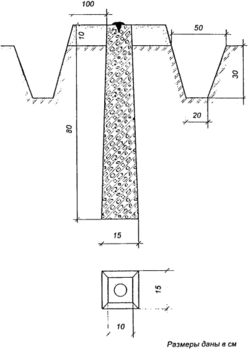 - бетонный пилон размером 12 х 12 х 90 см, в верхней конец которого заделывается кованый гвоздь, а в нижнюю часть для лучшего скрепления с
