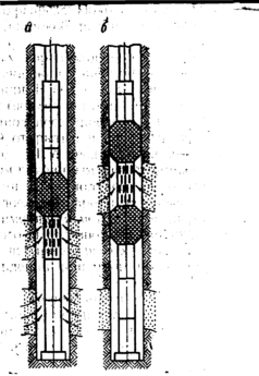 В процессе испытаний продуктивных горизонтов при помощи испытателей пластов, спускаемых в скважину на трубах, как правило выполняют два цикла испытаний. В первый цикл входят начальный открытый период испытания (период притока) и начальный закрытый период испытания (период восстановления давления). Второй цикл, включает конечный открытый и конечный закрытый периоды испытания. Для получения более достоверной информации испытаний за последнее время на отечественных месторождениях и в США применяется метод многоциклового испытания, в процессе которого выполняют до четырех циклов испытания (четыре открытых и четыре закрытых периода). При обычном испытании пластов с опорой инструмента на забой (рис3.2.1, а) в компоновке испытателя применяют один пакер и испытываемый объект изолируется им от вышерасположенного ствола скважины. Приток жидкости (газа) из пласта происходит из всего вскрытого интервала через подпакерное пространство скважины. Поэтому при наличии нескольких прослоев с разной проницаемостью невозможно определить, из какого интервала получен приток пластовой жидкости.