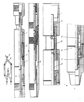 Раздвижное устройство (рис.3.3.5) предназначается для сохранения сжимающей осевой нагрузки на пакер в момент приподъема инструмента, когда закрывают приемный клапан испытателя пластов. Оно состоит из верхнего корпуса 1; переводника 2 с системой переточных каналов 3, клапанов 4; нижнего корпуса 5 и центрального штока 6, заканчивающегося резьбовым переводником 7.