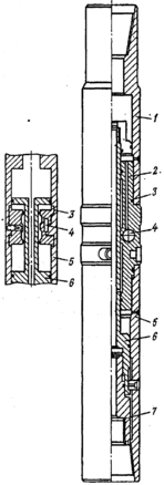 Испытатель пластов (рис.3.3.4, а) имеет специальную камеру 5. через которую происходит приток пластовой жидкости в трубы, а при закрытии приемного клапана в конце испытания в ней поднимают пробу пластовой жидкости, т.е. она выполняет функцию пробоотборника. На верхнем штоке 1 имеется фигурный паз 2, по которому скользит сухарь 3, закрепленный в верхнем переводнике 4 испытателя пластов. Уравнительный клапан (рис.3.3.4, б) конструктивно весьма сложен. Он состоит из верхнего переводника 1 с центральной втулкой 2; верхнего 3 и нижнего 4 штоков; тормозной камеры 5, корпуса 6 и нижнего переводника 7. Поршень в тормозной камере установлен таким образом, чтобы обеспечивалось торможение штока при его движении вверх.