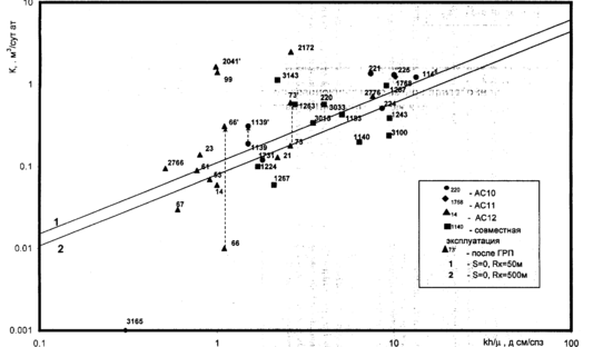 Скважины, попадающие ниже линии 2, имеют ухудшенную призабойную зону. Именно на этих скважинах необходимо в первую очередь проводить гидроразрыв пласта. Скважины, расположенные выше линии 1 имеют улучшенную призабойную зону. На этом рисунке нанесен ряд скважин, на которых ГРП уже проводился. Скважины до и после ГРП показаны одинаковыми номерами, но после ГРП номер поставлен со штрихом. Наглядно видно, что в результате ГРП гидропроводность удаленной части пласта не меняется, но возрастает коэффициент продуктивности. Это показано стрелками. Причем, увеличение коэффициента продуктивности происходит даже в том случае, когда призабойная зона до ГРП не была ухудшенной.