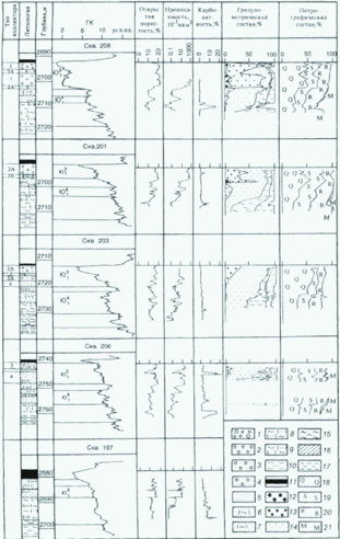 1-10 - литологические типы пород: 1-7 – песчаники;1 - крупно-среднезернистые; 2- среднезернистые; 3- средне-мелкозернистые; 4-средне-мелкозернистые глинисто-алевритистые и алевритовые; 5- мелкозернистые глинисто-алевритистые; 6- мелкозернистые алевритовые и глинисто-алевритовые; 7- алевритисто-глинистые; 8,9 - алевролиты (8 - песчаные, 9 - песчано-глинистые); 10- аргиллиты; 11- угли; 12-17 - гранулометрические фракции: 12-14 - песчаные (12 - крупнозернистые, 13- среднезернистые, 14- мелкозернистые); 15,16 – алевритовые (15 - крупнозернистые, 16- мелкозернистые); 17- глинистые; 18-21 - петрографический состав обломочной части: 18- кварц; 19- полевые шпаты; 20 - обломки горных пород; 21 – слюда.
