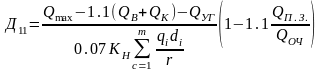 где Qmax – максимальное количество воздуха, проходящее через канал вентилятора, м3/мин; QВ и QК – количество воздуха для проветривания соответственно поддерживаемых выработок и камер, м3/мин; QУТ – утечки воздуха в выработанное пространство, м3/мин; Kн – коэффициент неравномерности выделения метана; m – число одновременно разрабатываемых пластов; qi – выделение метана на 1 т добычи по пласту, м3/мин; di – доля добычи данного участка в общей добыче шахты; r – допустимое содержание метана на исходящей струе шахты (не более 0,75%) и участков (не более 1%); QП.З. и QОЧ – количество воздуха для проветривания соответственно подготовительных и очистных забоев, м3/мин.
