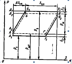 Расстояние между перпендикулярами, опущенными из крайний точек динамограммы (точки А и В) на ось, соответствует ходу полированного штока S. Ход плунжера Sпл соответствует расстоянию между перпендикулярами, опущенными на ось из точек Б и В.
